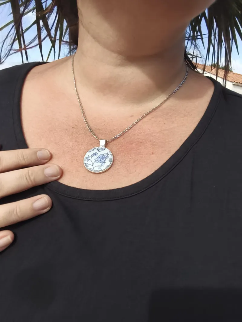 Chainette en métal argenté. Médaillon avec incrustation de porcelaine. Motif floral.
